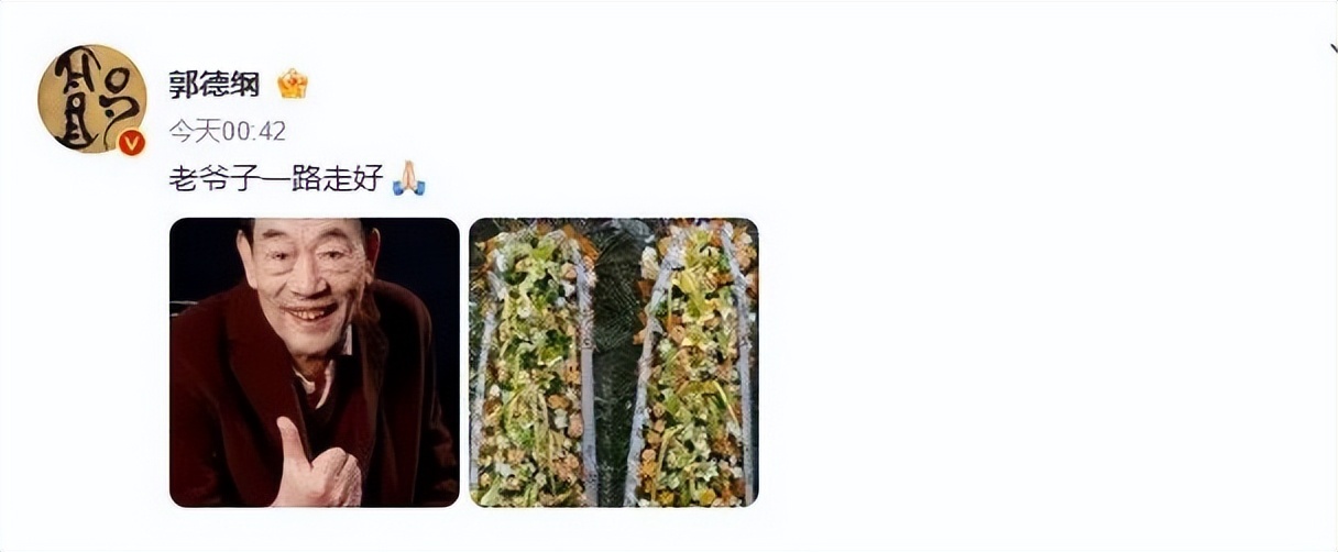 10日凌晨,郭德纲在微博发文悼念:“老爷子一路走好”,并配图杨少华生前照片及德云社敬献的花圈。